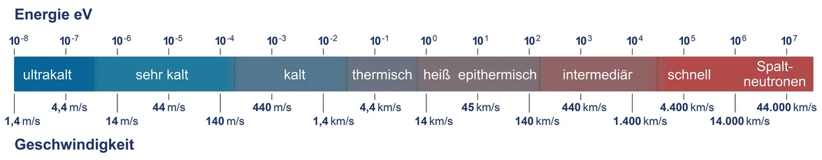 | Schnelle/heiße Neutronen | 40 – 103 meV | 2300 K | 0,05 nm | 5 km/s |